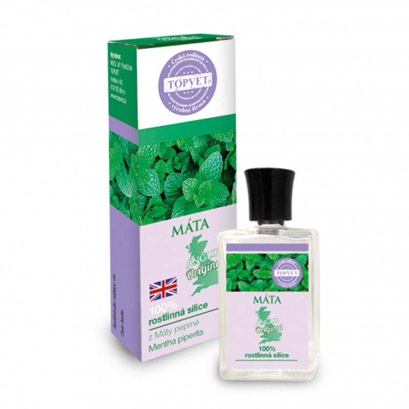 Původ Máty peprné nalézáme v Anglii. Bylina obsahuje silice, ve kterých je více než 50% mentolu. Máta vykazuje antiseptické účinky a pomocí aromaterapie usnadňuje dýchání při nachlazení a obtížích horních cest dýchacích. Snižuje horečku, účinně působí při trávicích obtížích, nadýmání či křečích. Máta povzbuzuje vitalitu a napomáhá také při migrénách a nervovém vypětí.